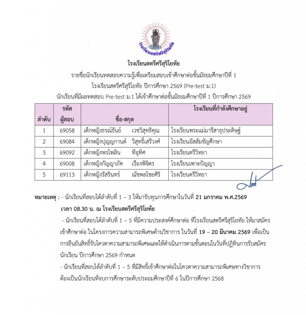 รายชื่อผู้มีสิทธิ์เข้าร่วมการทดสอบ Pre-test ม.1