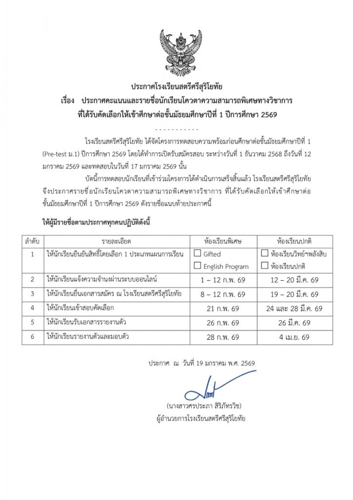 ผลคะแนนและรายชื่อนักเรียนโควตาความสามารถพิเศษทางวิชาการ