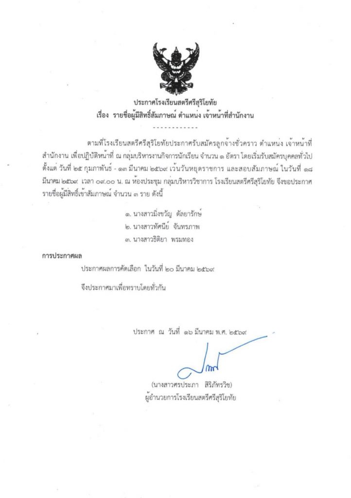รายชื่อผู้มีสิทธิสัมภาษณ์ ตำแหน่งเจ้าหน้าที่สำนักงาน