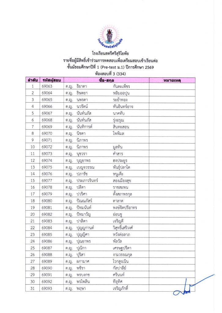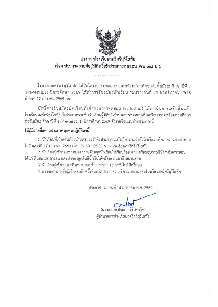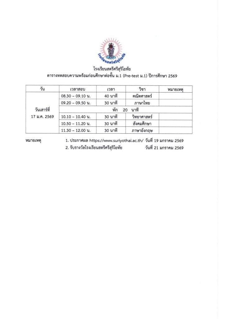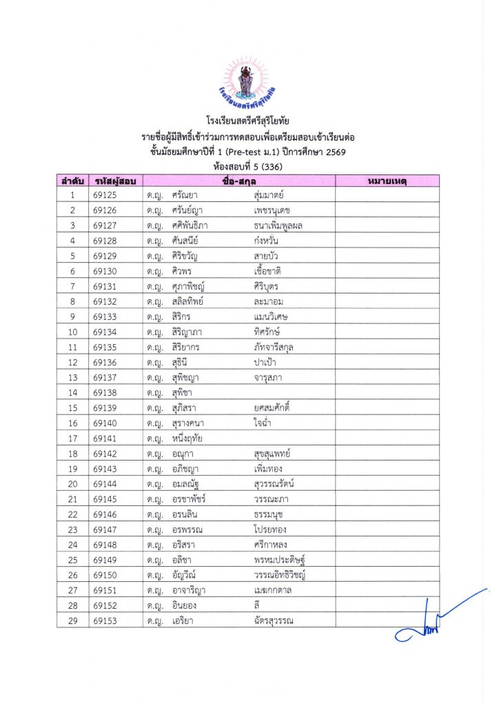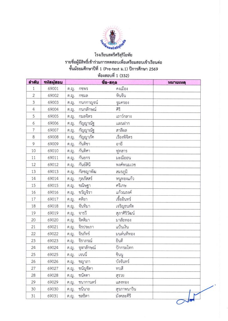 รายชื่อผู้มีสิทธิ์เข้าร่วมการทดสอบ Pre-test ม.1