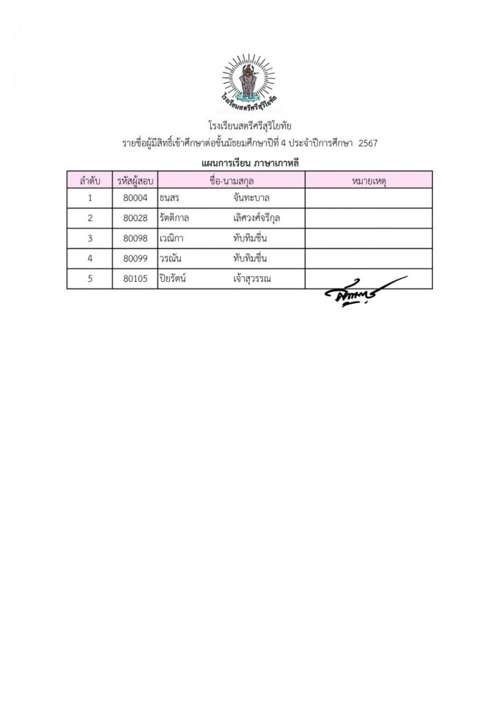 ผลการรับนักเรียนเข้าศึกษาต่อระดับชั้น ม.4 ปีการศึกษา 2567 (ห้องเรียนปกติ)