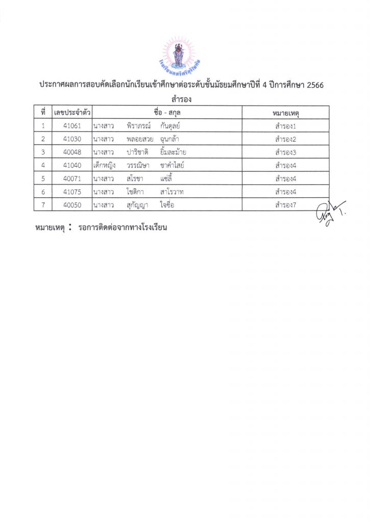 ผลการสอบคัดเลือกเข้าศึกษาต่อในระดับชั้นมัธยมศึกษาปีที่ 4 ปีการศึกษา 2566 (ห้องเรียนปกติ)