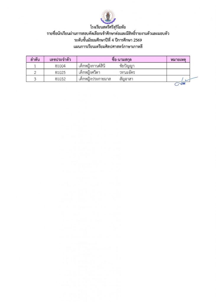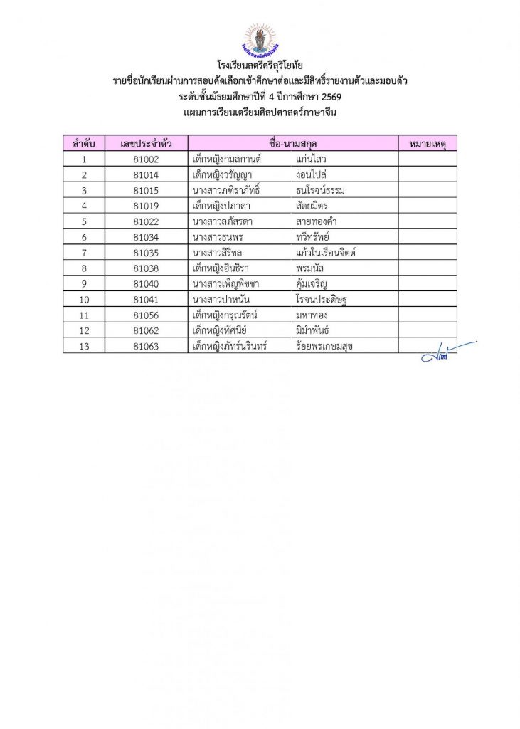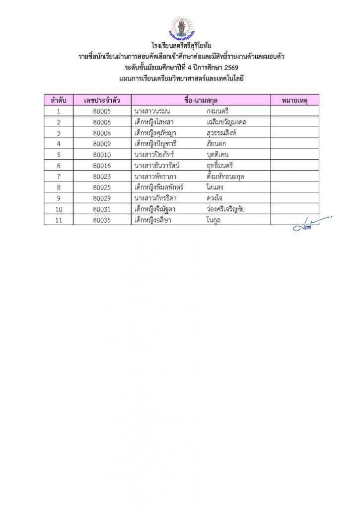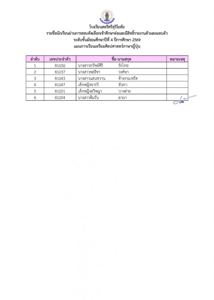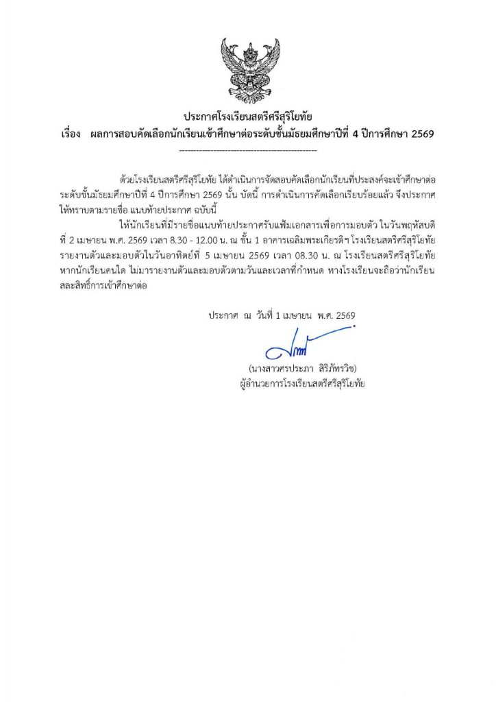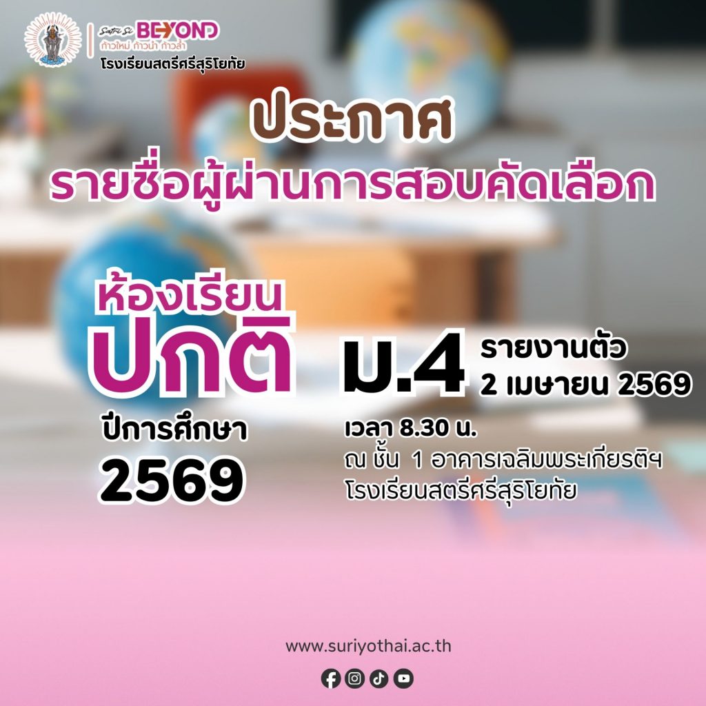 📢ประกาศรายชื่อผู้ผ่านการคัดเลือกเข้าศึกษาต่อระดับชั้น ม.4 ประเภทห้องเรียนปกติ ปีการศึกษา 2569